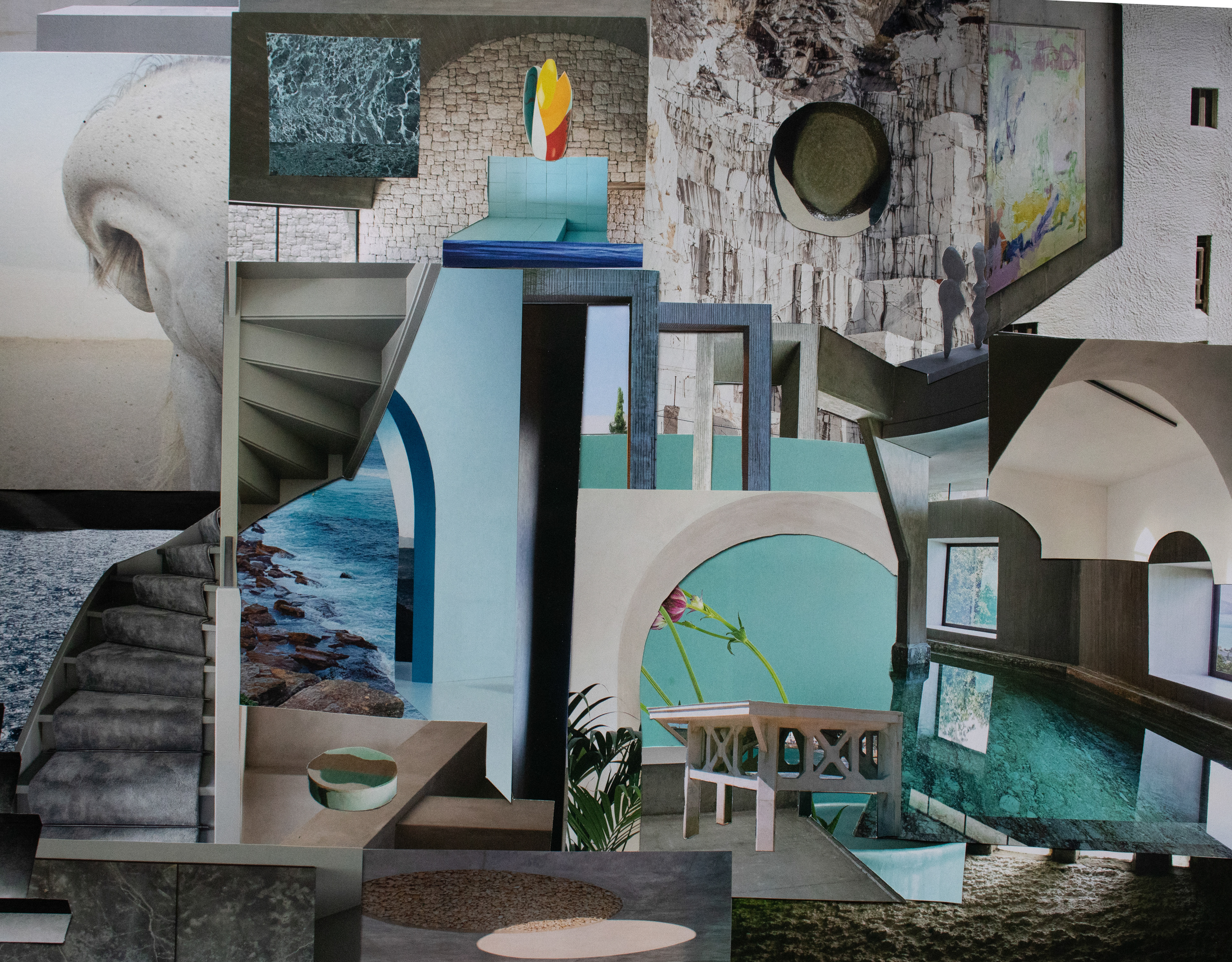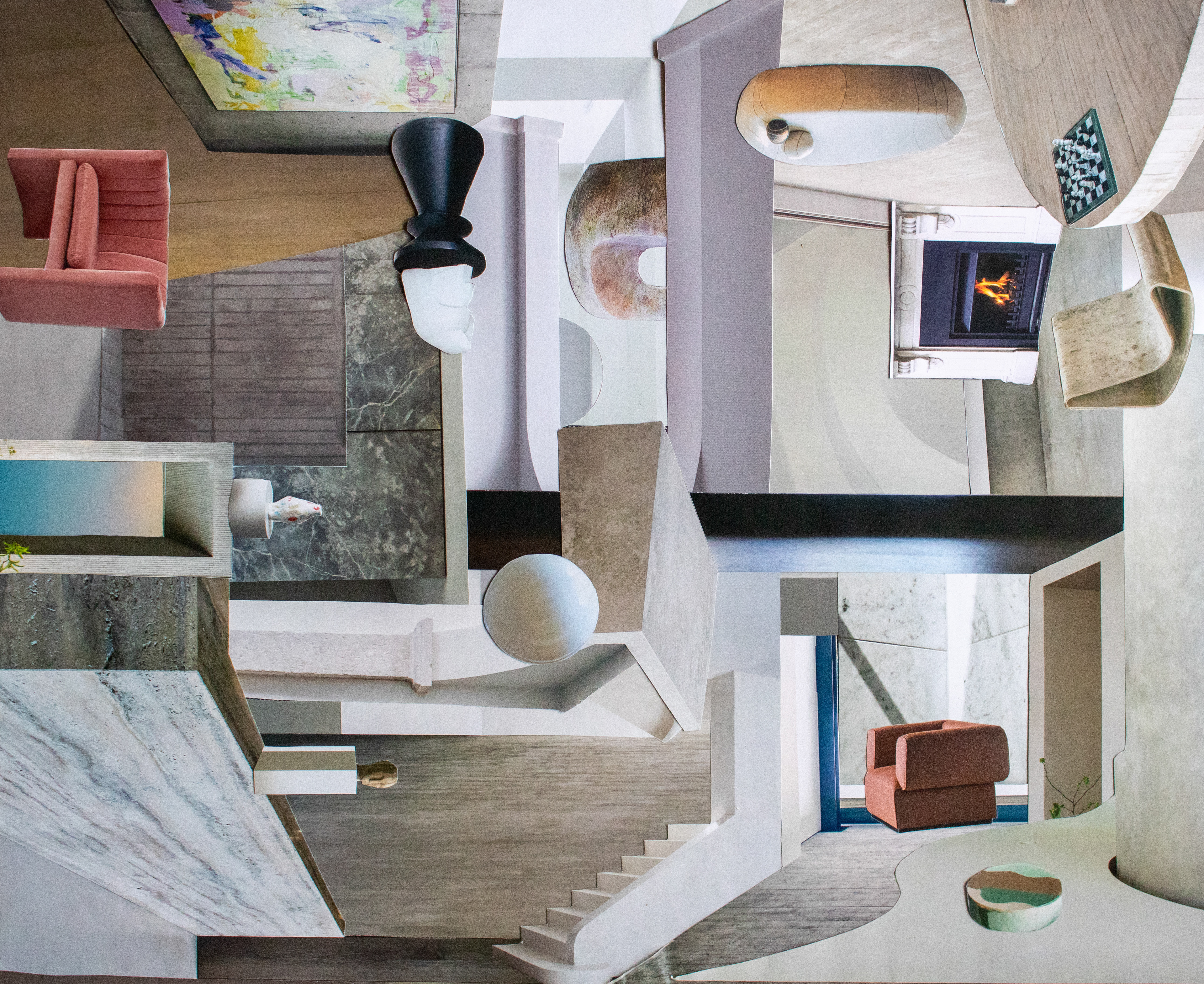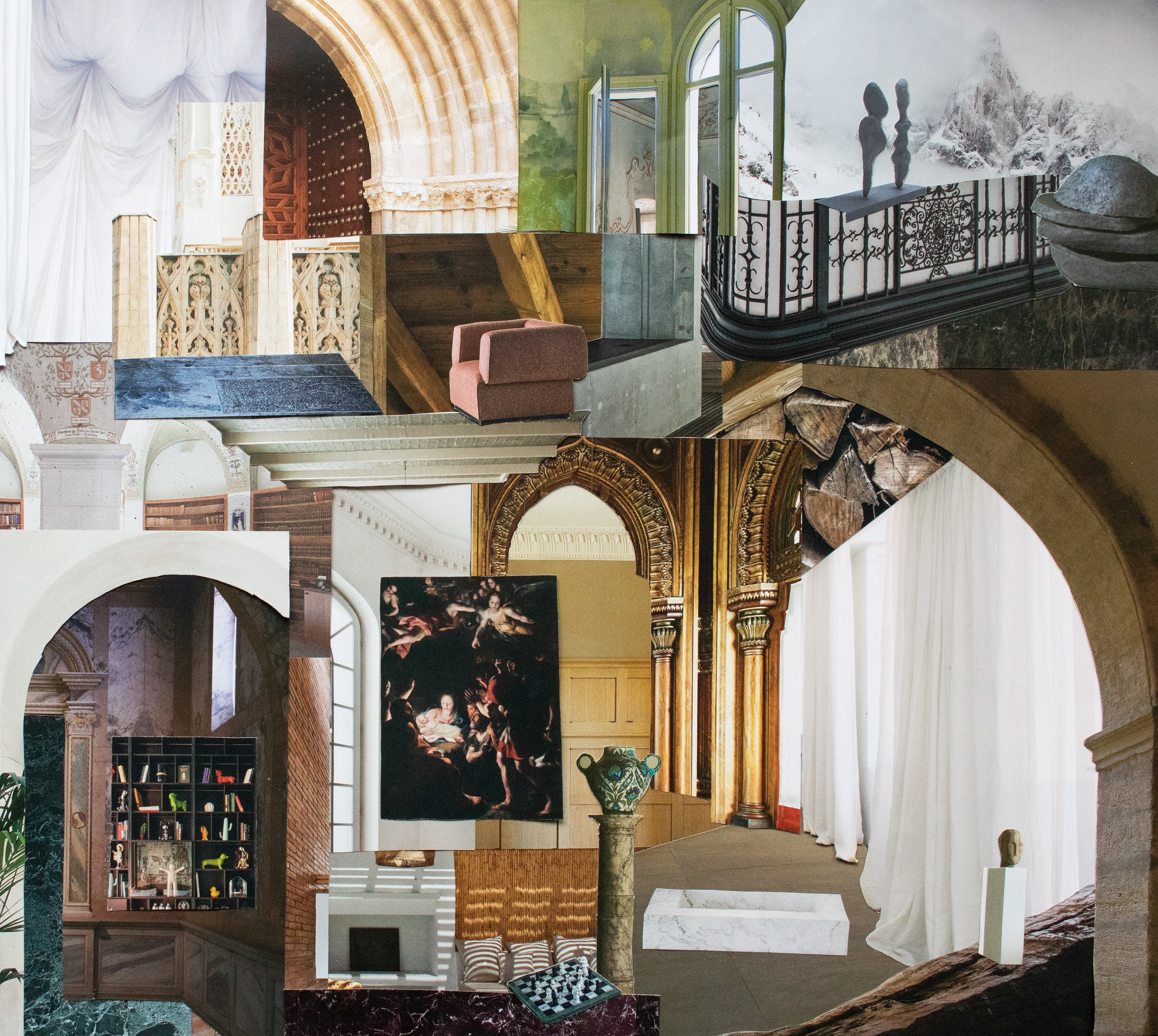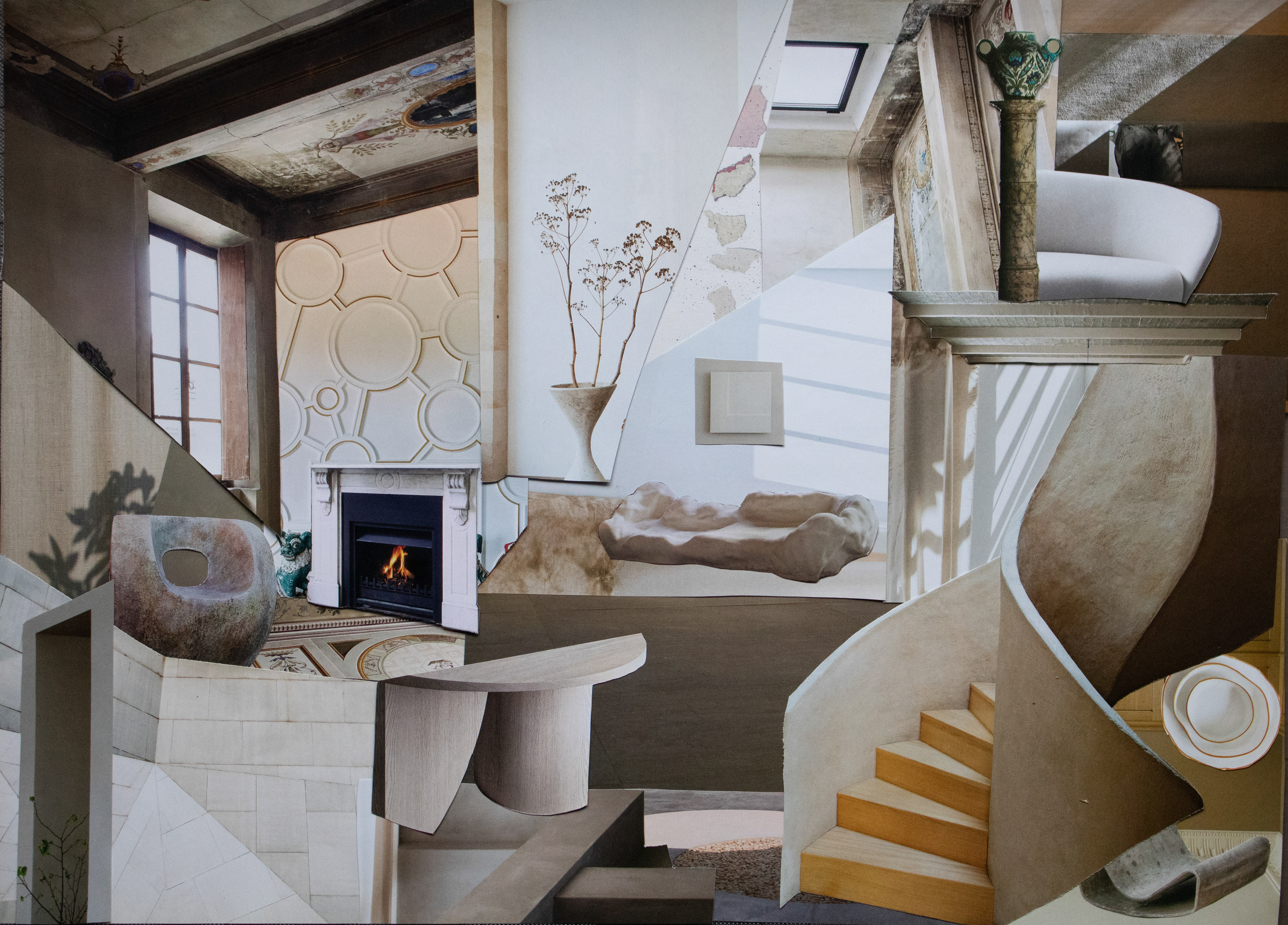 For the clippings of the different Life Style, Architecture and Design magazines I pay attention to the quality of the photos and the quality of the printed paper and motifs that have a life of their own regardless of their context. A staircase may interest me not because of its function to climb, but because of its geometry, for example. To select the cuttings I let myself be guided by an aesthetic intuition regarding colours and shapes. At that moment I do not have the final image defined yet, but I put the clippings in a file that will serve me as a quarry for the next phases of work. It is an archive where my fantasies and aesthetic concerns lie.