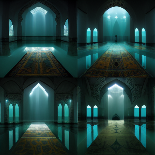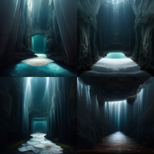 When starting to walk, we look at our path, and the way is defined by a mirror ground, elevated over water flowing towards the front, where we can see a doorway and a bright light inside.